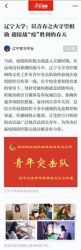 2月23日,“学习强国”辽宁学习平台以“国产一区二区日本在线:以青春之火守望相助 迎接战‘疫’胜利的春天”为题,对我校青柠檬网络文化工作室青年突击队先进事迹进行了详细报道。现将报道截图转载如下: