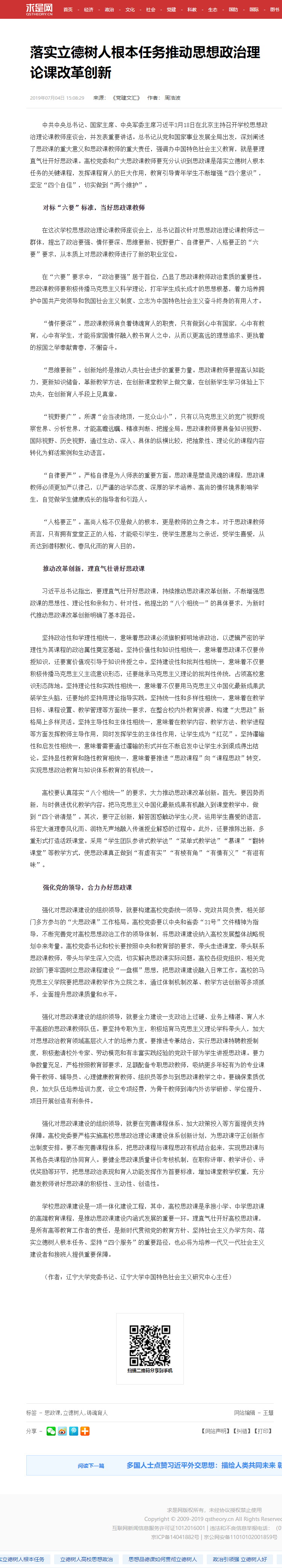 7月4日,求是网转载了我校党委书记周浩波教授于《党建文汇》杂志2019年第6期刊发的理论文章《落实立德树人根本任务 推动思想政治理论课改革创新》。现将全文转载如下。