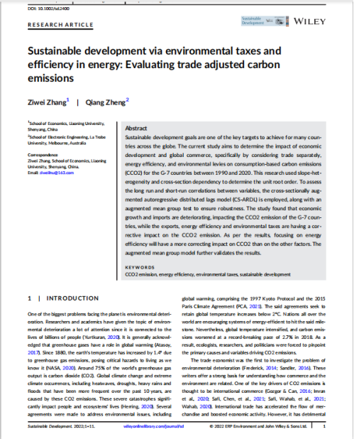 经济学院张紫薇副教授作为第一作者的合作论文Sustainable development via environmental taxes and efficiency in energy: evalsuating trade adjusted carbon emissions在Sustainable Development发表。